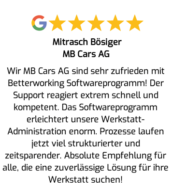Entdecken Sie, wie BetterWorking als innovatives Dealer Management System (DMS) für Garagisten und Reparaturwerkstätten Ihre täglichen Abläufe optimiert. Unsere benutzerfreundliche Lösung hilft Ihnen, Ihre Werkstatt effizienter zu verwalten, indem sie administrative Prozesse vereinfacht und wertvolle Informationen für Reparaturen und Wartungen bereitstellt. Testen Sie das BetterWorking DMS 30 Tage kostenlos und unverbindlich.